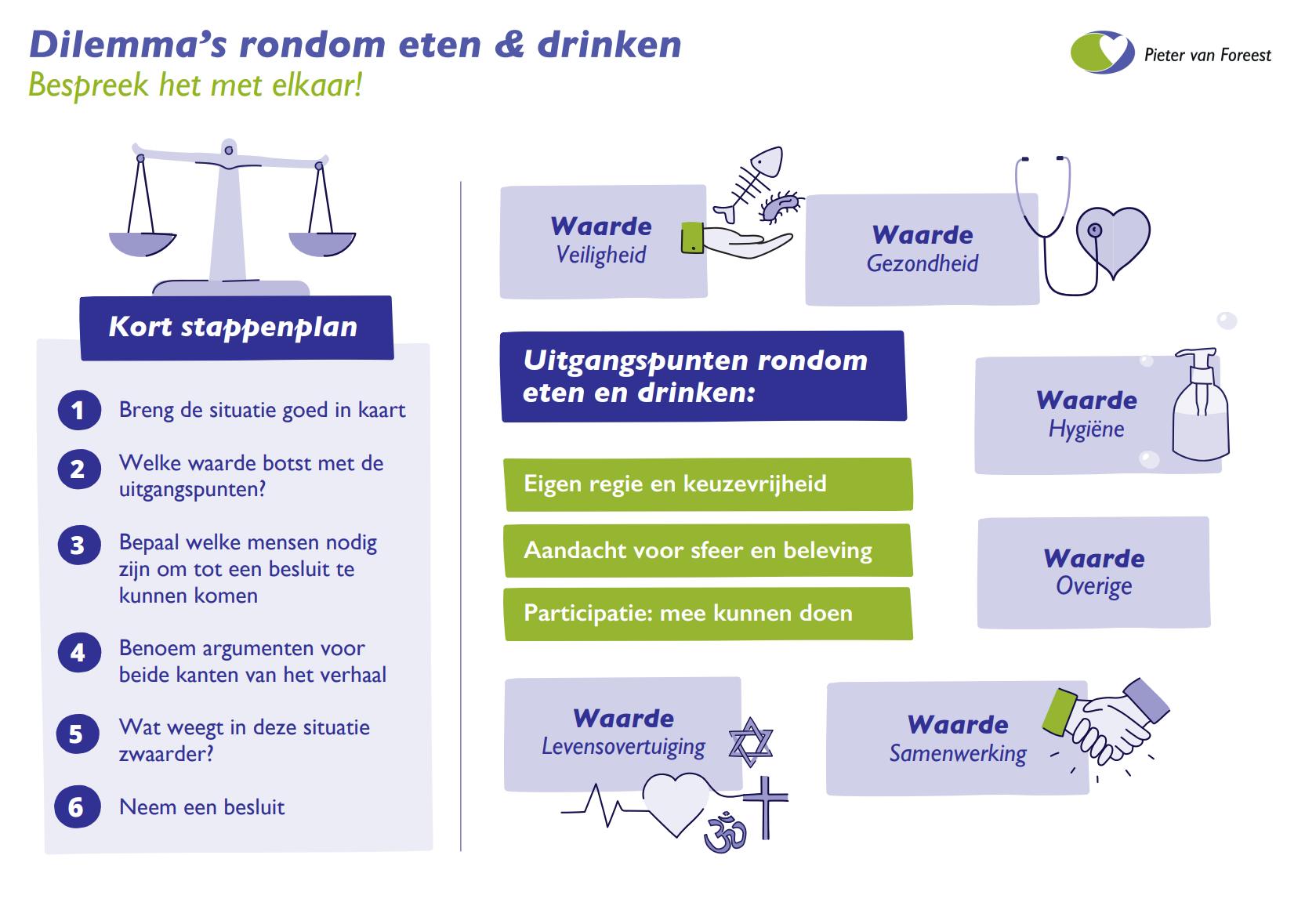 Zelf hebben we regelmatig een moreel beraad of een gesprek met bewoner, familie en relevante collega’s als het gaat over slikproblemen. Keuzes maken zijn dan soms lastig: de een kiest voor veiligheid om een longontsteking of verstikking te voorkomen. De ander vindt dat de bewoner, ongeacht het risico, gewoon moet kunnen eten wat hij/ zij wil. Ik neem dan de Praatplaat van Zorg voor Beter erbij. Ter educatie en om te komen tot het goede gesprek over welke waarden voor de betreffende persoon het belangrijkst zijn. Zo werken we echt samen op een manier die het best past bij die persoon/ bewoner.